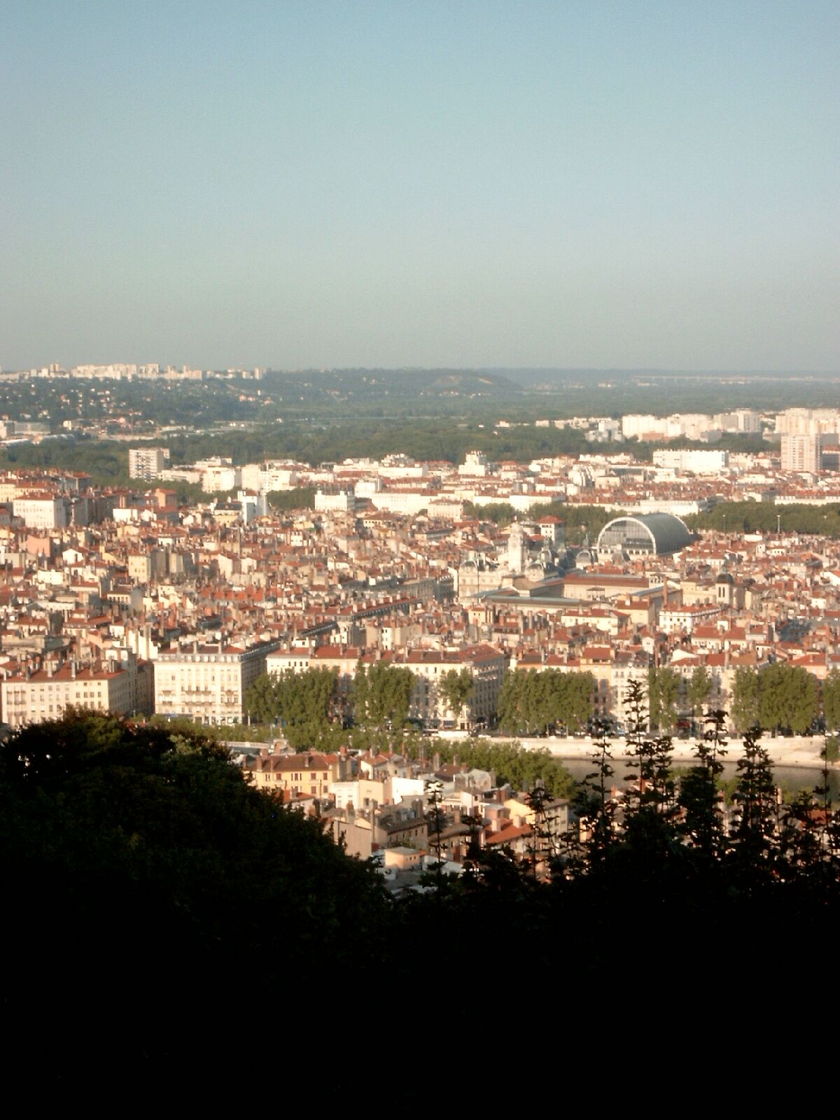 Blick auf Lyon. Das Gebäude mit dem gewölbten Dach ist die Oper, die Hochhäuser dahinter sind in Villeurbanne und das Centre de Calcule liegt dort direkt an den grünen Flächen im Rhônetal. (14/81)